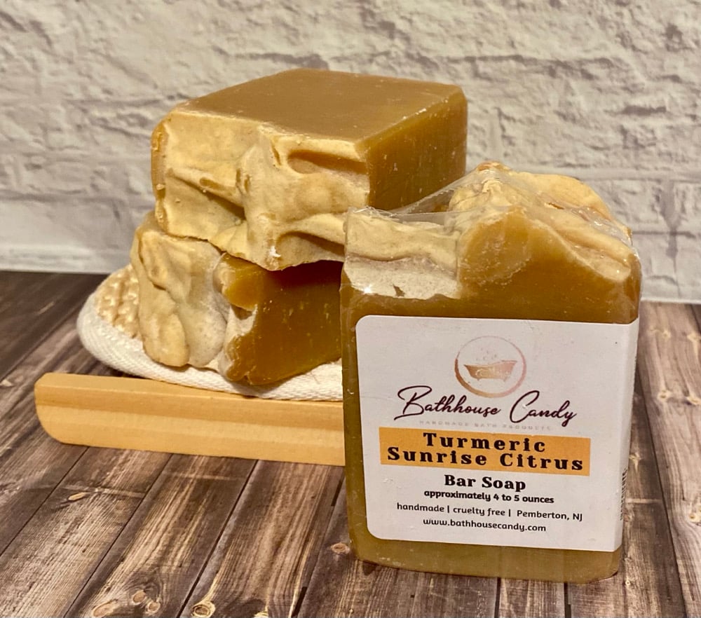 Discover the revitalizing power of our Turmeric Sunrise Citrus Bar soap. Immerse yourself in the invigorating blend of turmeric, lemon peel, and shea butter, complemented by the refreshing essence of pink grapefruit and lemon essential oils. Unveil a radiant glow with every use, as this artisanal soap gently exfoliates and nourishes your skin, leaving you refreshed and renewed. Elevate your skincare routine with the natural goodness of Turmeric Sunrise Citrus Bar.